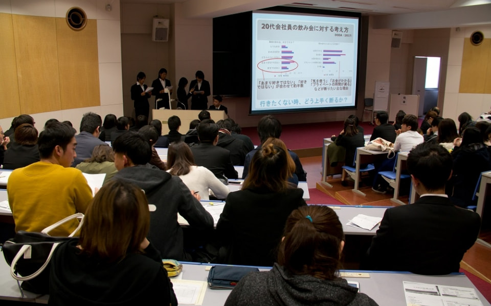 まさに1年間の集大成の発表。ビジネススーツをまとった学生たちが、日ごろ磨いたプレゼンテーション・スキルを存分に発揮します。1年生にとっては、気になるゼミを見つけ、自分のやりたい分野へと進むための第一歩。メモを片手に、熱心に聞き入ります。2年生以上の学生も、それぞれプログラムを片手に、興味あるテーマを聴きに他のゼミの発表を見学したり、知人・友人の発表を聴きに行ったりしています。