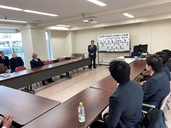 会計人会の会員である岩下先生から税理士業務の心構え、取り組み、税理士のミッションなどを熱い想いを込めて、合格者の皆さんにエールが送られました。また、校友会会長の八城先生からは、お祝いと校友会活動の話がありました。