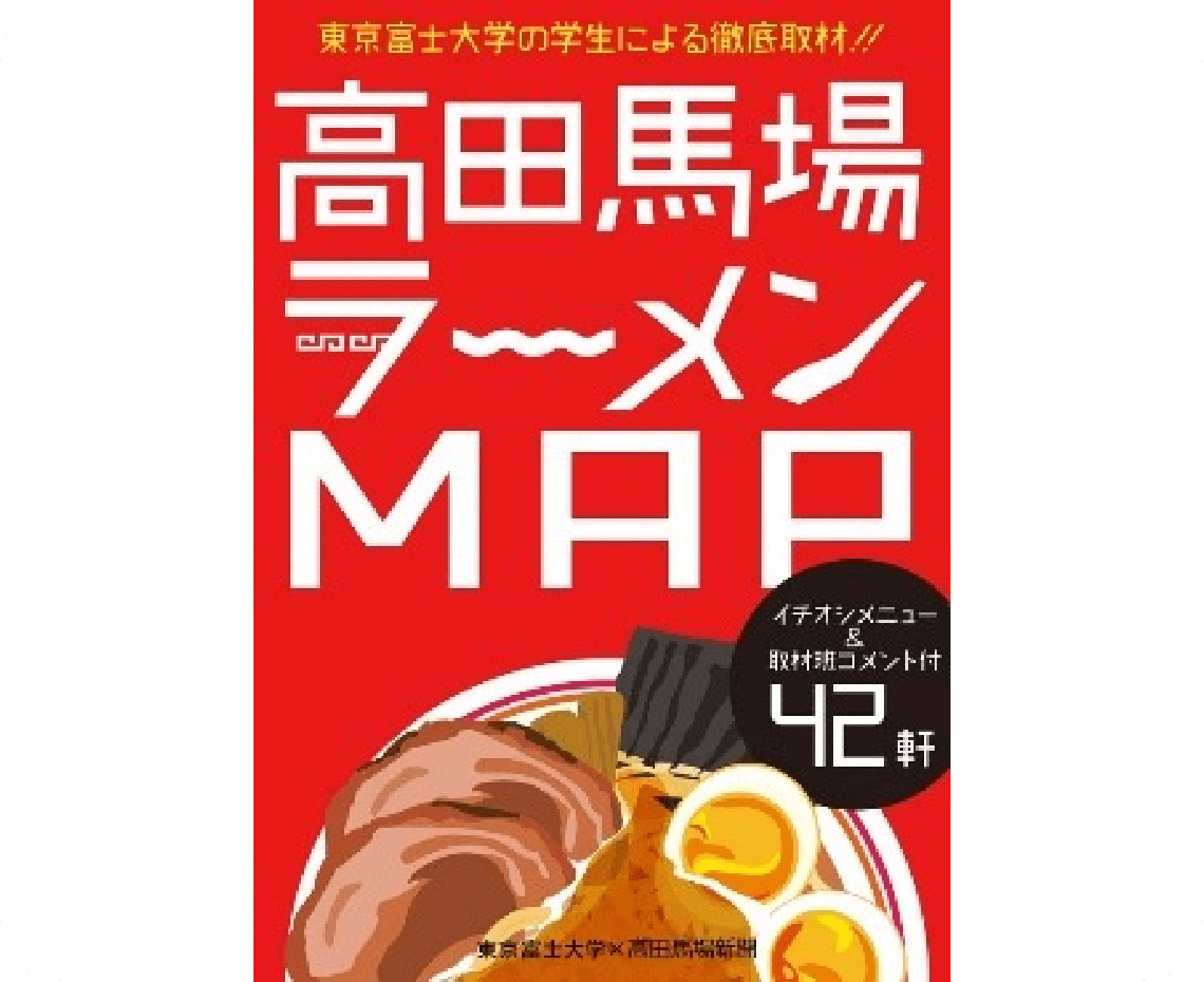 ラーメン激戦区である高田馬場のラーメン店42店舗を訪問・試食のうえ、コメント入りのマップを作成して印刷・配布しました。ラーメンの街としての新たな顔づくりを行い、来訪者の食べ歩きを促進する目的で実施したものです。