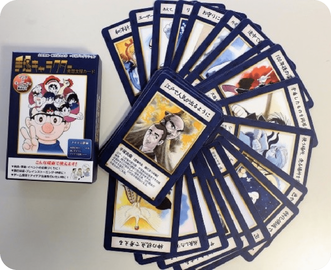 手塚治虫作品に登場した40のキャラクターを使ったビジネスアイデア開発ツールの制作。手塚プロダクション監修のもと、ゲームビジネス研究塾と顧問教員によって考案され、基本設計、プロトタイプ制作、テストマーケティング、デザイン、地域企業・住民を集めたワークショップなどを実施しました。