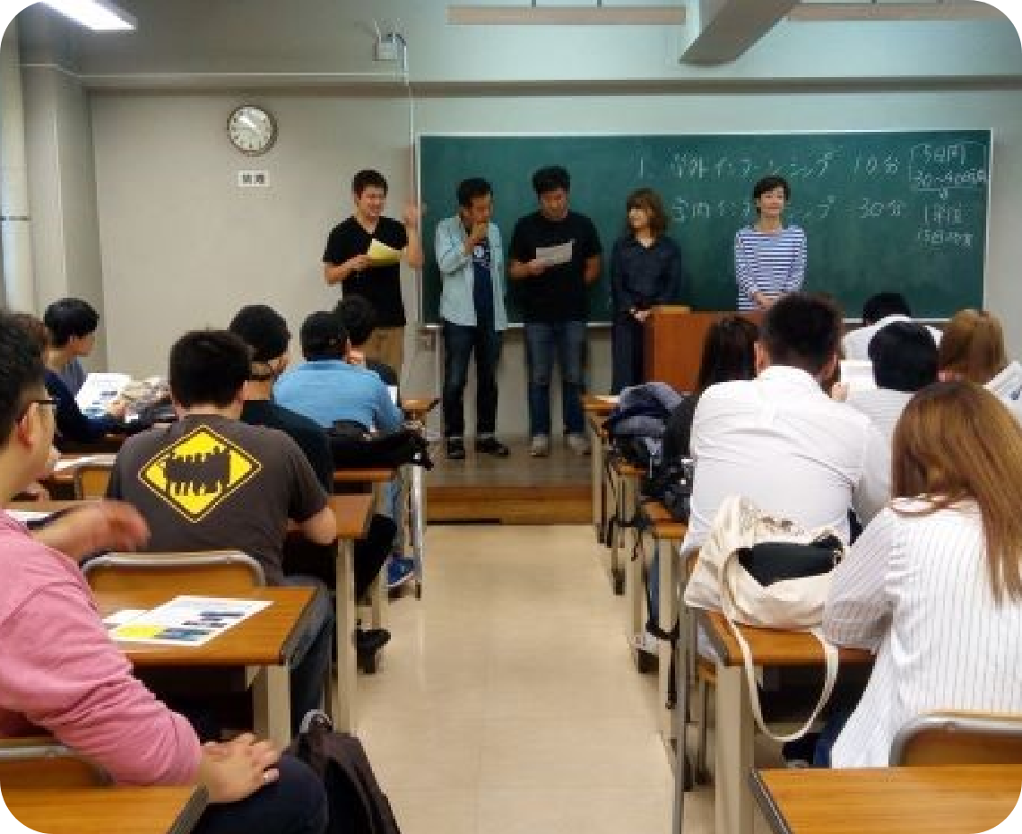 大手企業の経営に実際に携わってきたリーダーを招聘し、「業界における競争環境の変化」「企業組織」「職務内容」「必要な職務上の能力」などについて語ってもらいます。